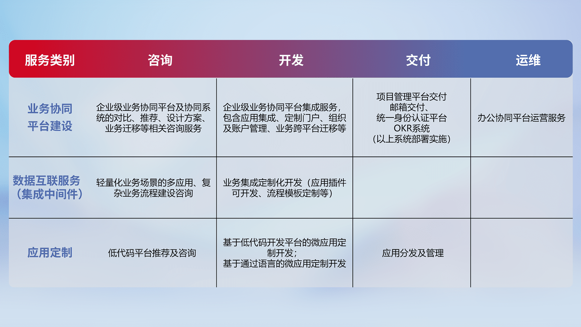 针对钉钉、、企微、、、、IDaas等平台级产品提供产品的规划、、、方案、、、、交付、、、、定制化开发等服务,,实现如统一协同办公、、、、智能客户服务、、混合会议管理、、、智能数据查询、、等业务场景,,实现数字化转型。。。